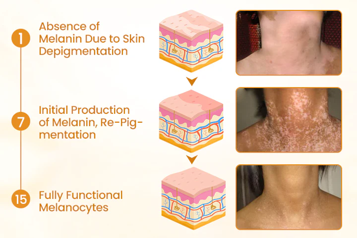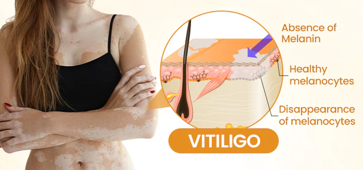 This results in the appearance of achromatic (white) patches on the skin, which can appear anywhere on the body. Although it does not cause physical damage, it often causes emotional distress and self-esteem issues due to its visibility.